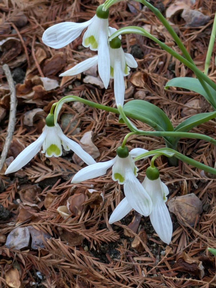 ①②スノードロップ ヒガンバナ科 マツユキソウ属(ガランサス属)二枚目に見える花の根本の緑の丸い緑の玉が土に根付いても増えるそうです!