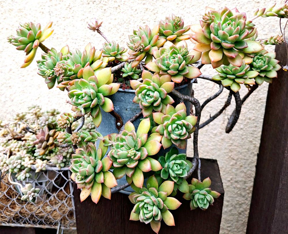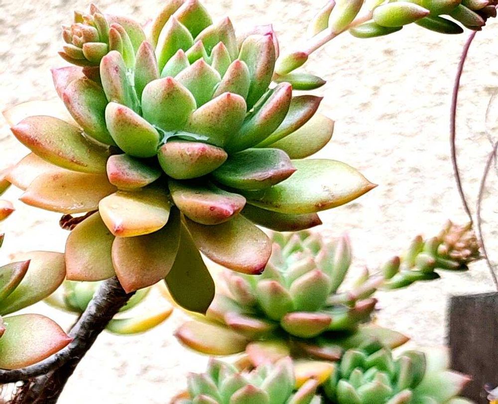 暴れ多肉ぶりは変わりませんが、うっすらピンクに色付いて、花芽もいくつかでてきました。