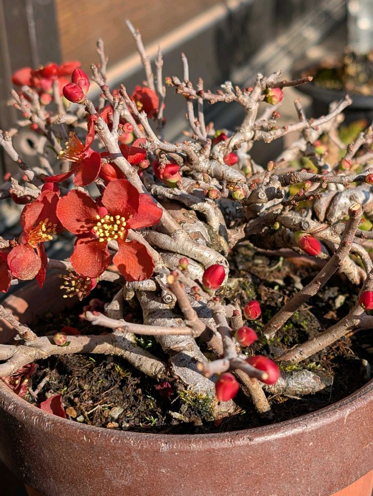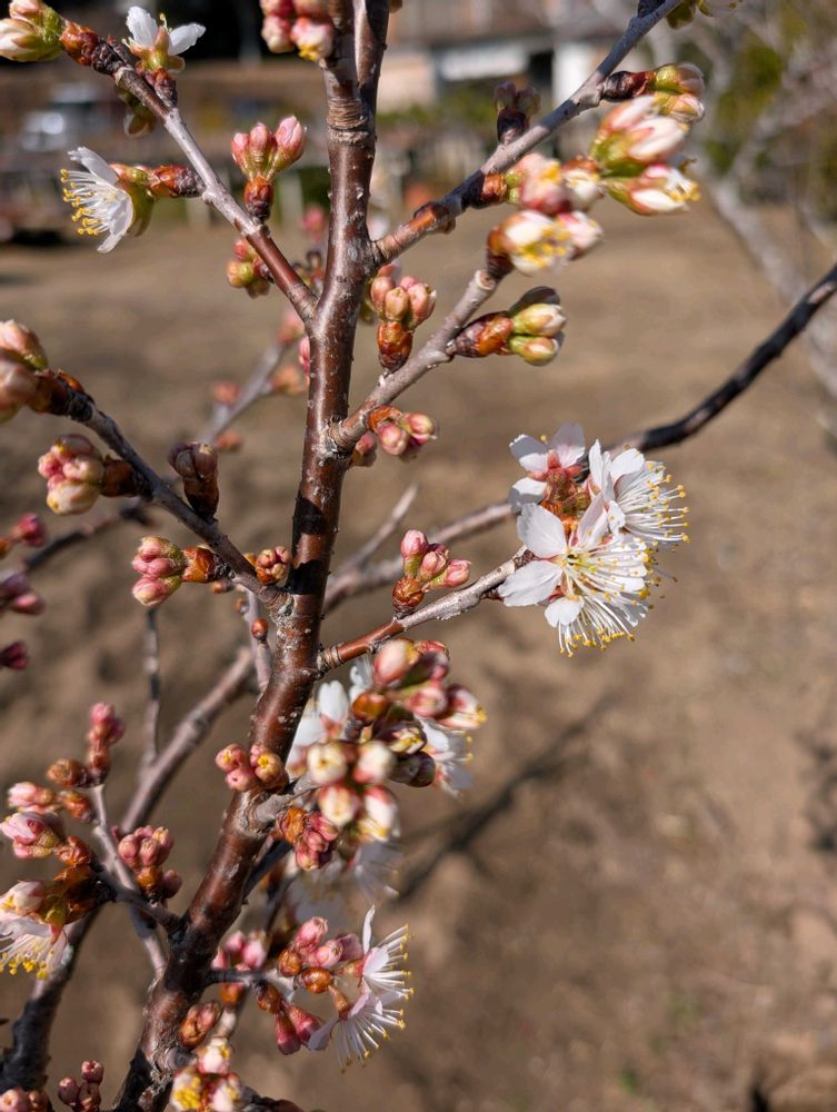 サクランボの交配用にナポレオンを植えたら良いよって言われてますが残念な事に他のサクランボは未だ開花してないので?挙句にナポレオンの交配樹が無い為か実付きが悪いんです〜友人宅の長寿梅の花色濃くないですか?茶色に近い色が珍しいのか今後に期待 春先の黄色の樹木から花色も変わり椎の木の芽吹きの金華山の様に山の色も変わりますね〜