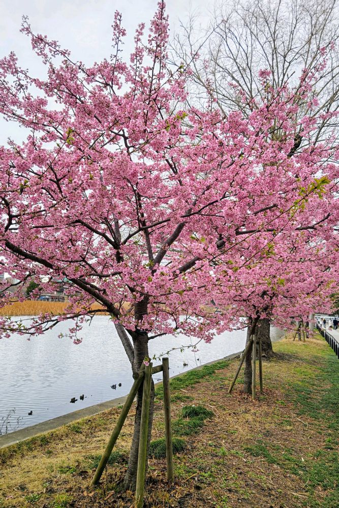 ①② 岸辺の河津桜が満開に、5本程植栽。