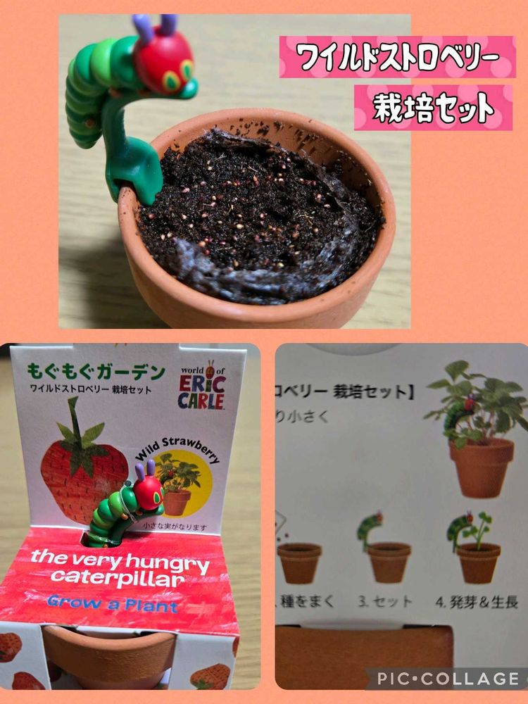 腹ペコ青虫と言うのですか?私も本物は嫌いですがフィギュアが可愛いと思いつい買ってしまいました🤭 小さい鉢なので芽が出たら植え替えないと絶対育たないな~と感じますが〰️🤣