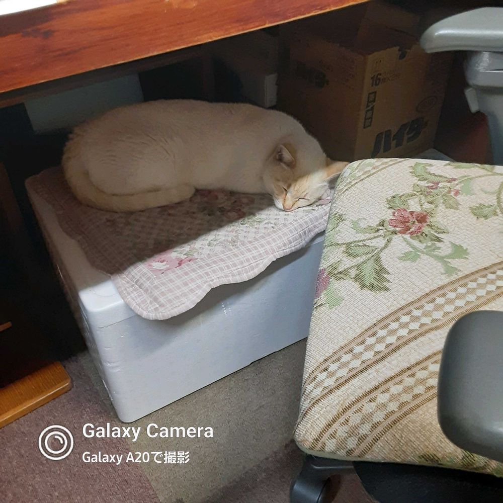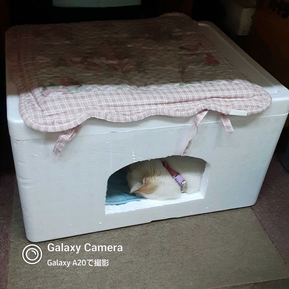 発泡スチロールで雨、風がよけれて凄くいいなぁと思いました。幸せな寝顔に癒されます🤗