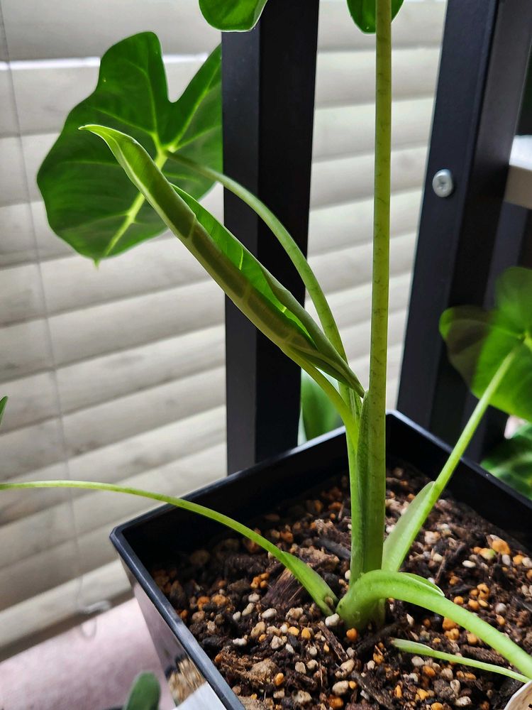 2025.8月に某サイトで購入した【アロカシア チャイ】の 突然変異?なんだろう 購入時、元々有った葉を(1枚目の葉)として、 下から新たな葉が出てきてる状態で到着しました(2枚目の葉) こちらに来て初めて出てきた葉に異変が。。 育て始めて出てきた初めての3枚目、4枚目 (途中から、斑1、斑2、、と続きます) どこまでこの謎の斑入葉が続くのか、 いや止まるのか……記録していきます