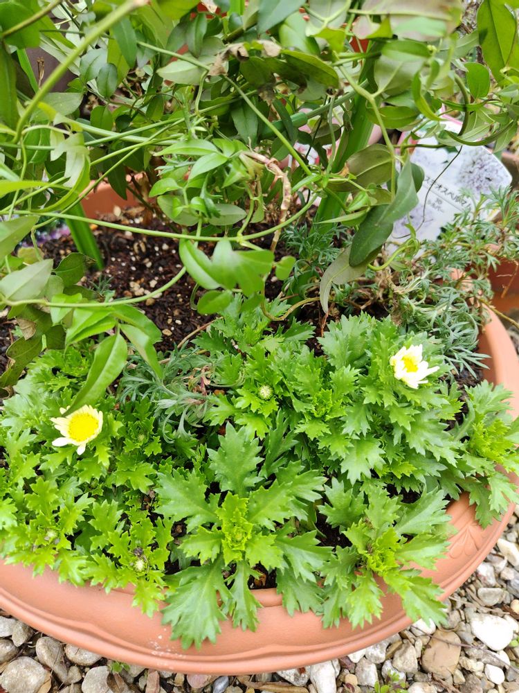 先日去年の寄せ植えを仕立て直して、羽衣ジャスミンの足元に植えたものです🤗
