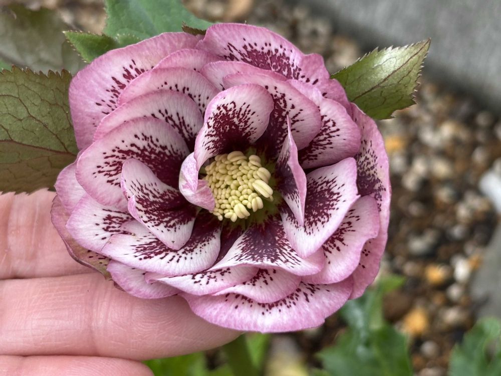 ピンク色の八重咲きで、ブロッチが入って素敵😆💕柄系のクリスマスローズは持っていないので、庭に植えてみたいです👍🎶