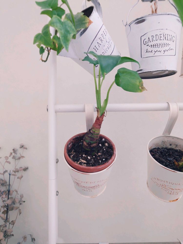 ラダーラックにセッティングしている観葉植物に少し前から加わった新たなお仲間、アロカシアことクワズイモです。