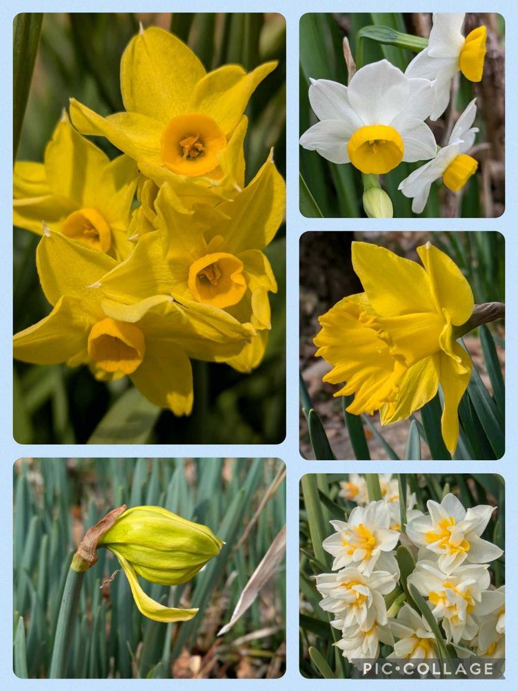 ③ニホンズイセンに続いて、ラッパスイセンが咲き、八重咲きの黄色いスイセンの蕾も膨らんでいます