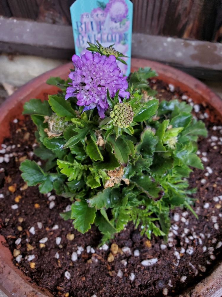 スカピオサは寒波にも耐えてひと冬ずっと花を咲かせてくれた。やっと購入時のポットから鉢へ移動。