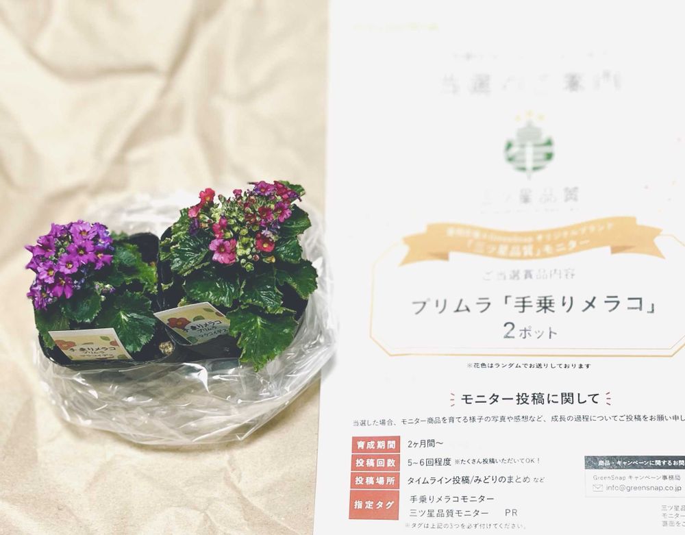 豊明市場×GreenSnapオリジナルブランド「光星品質」モニタープリムラ「メラコ」に当選しました👍