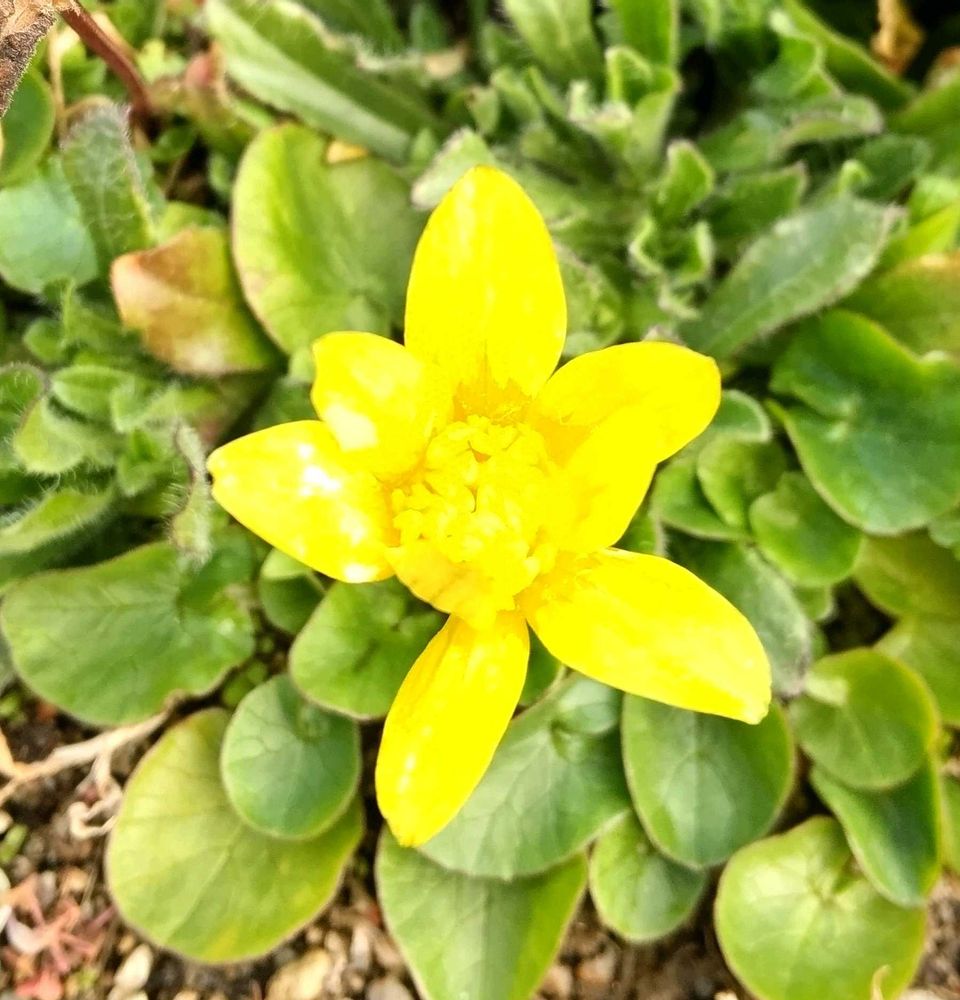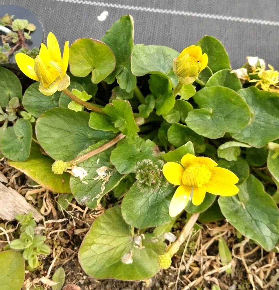 まだシートをはったままの花壇の中に咲いていたヒメリュウキンカ。