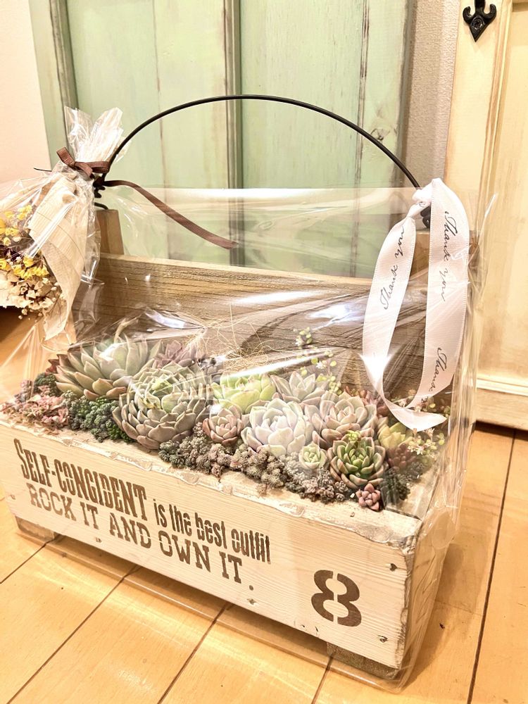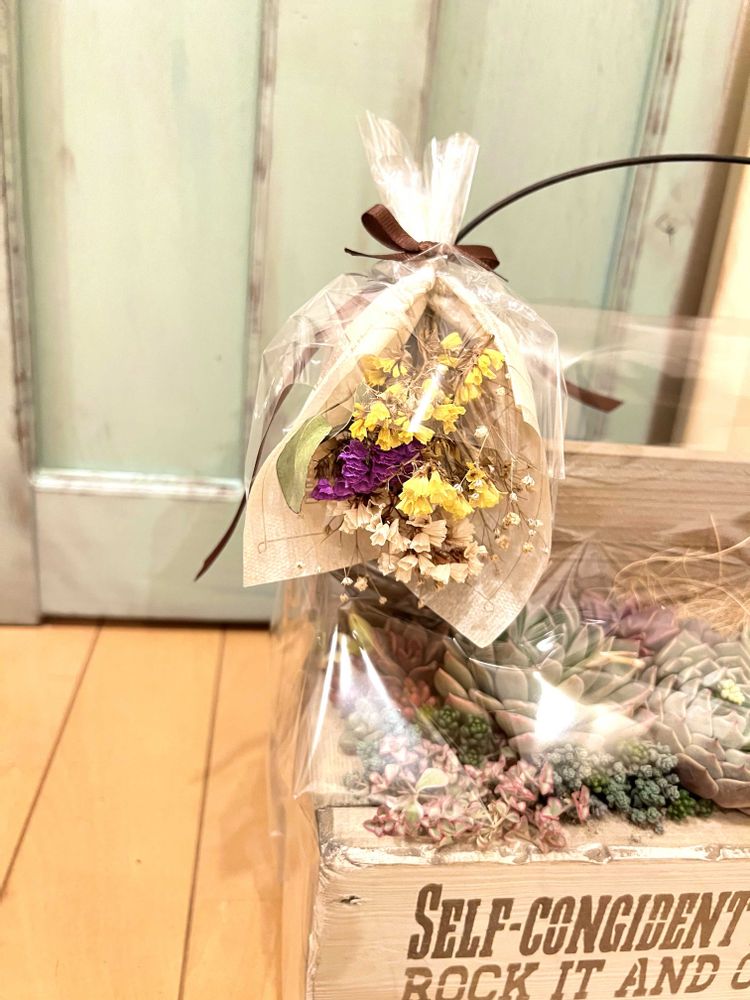 昨日、プレゼント🎁の寄せ植えを小さなスワッグを作って、リボンもつけてラッピング✨