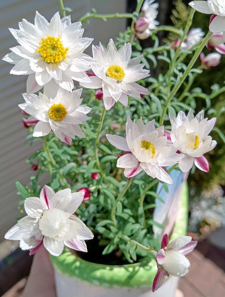 花弁の先の違いや赤い斑入りが何ともカワイイ〜花かんざしは白花まあるい花弁でした🌸