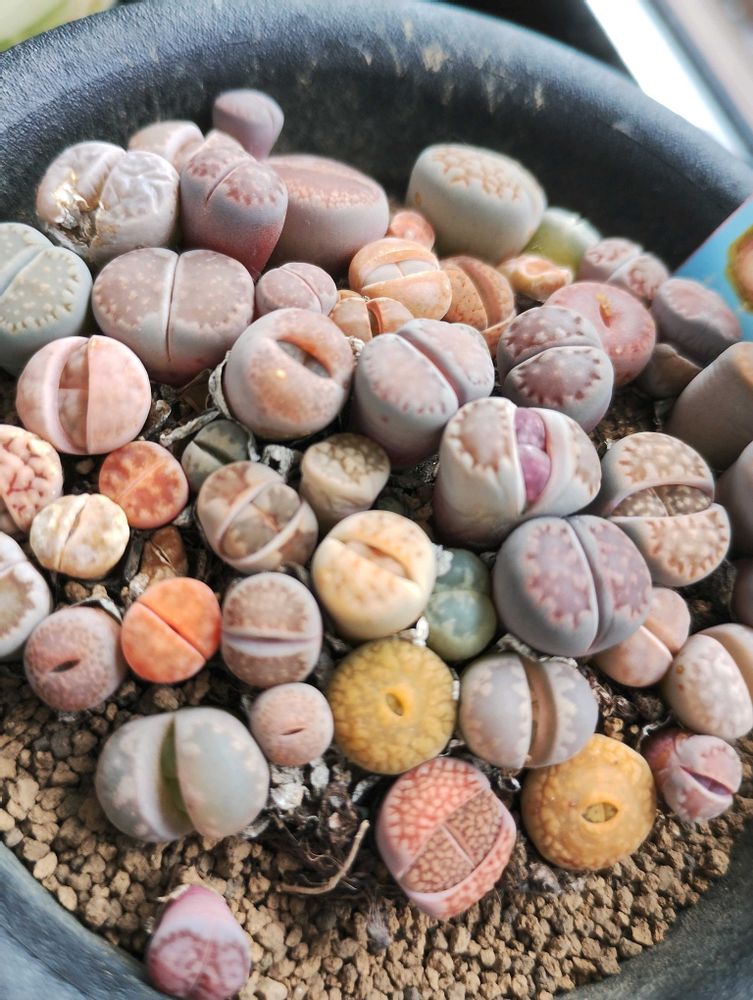 このリトープス沢山寄せ植えになってるの可愛いのですがここからどうしたら良いのかよく分からないです。このぎゅうぎゅうな感じで無事脱皮出来るのか心配です🤭