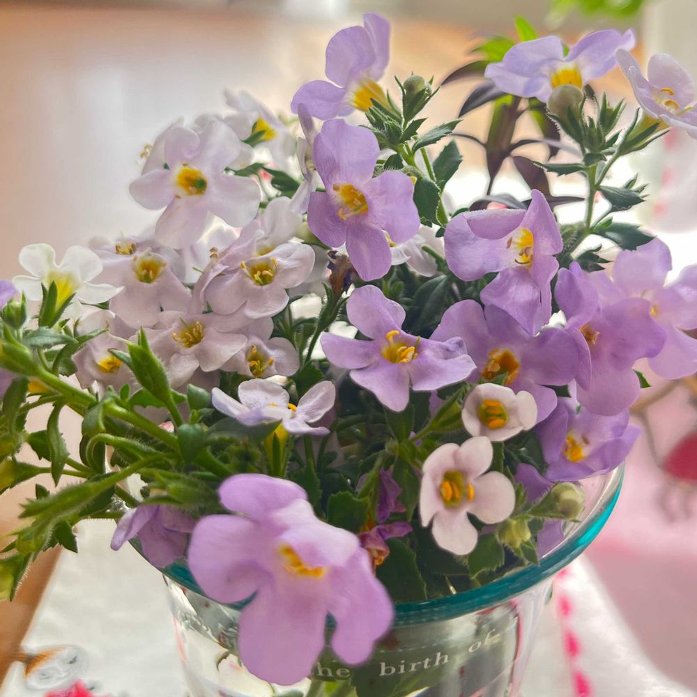 ちっちゃな花瓶に💕親は外にいるのですが、お花が乱れて来たので、切った子をお家の花瓶に入れてたら白い🤍色に変身した子がいる⁉️ブルー🩵と🤍になってるけど、何故だろう🧐