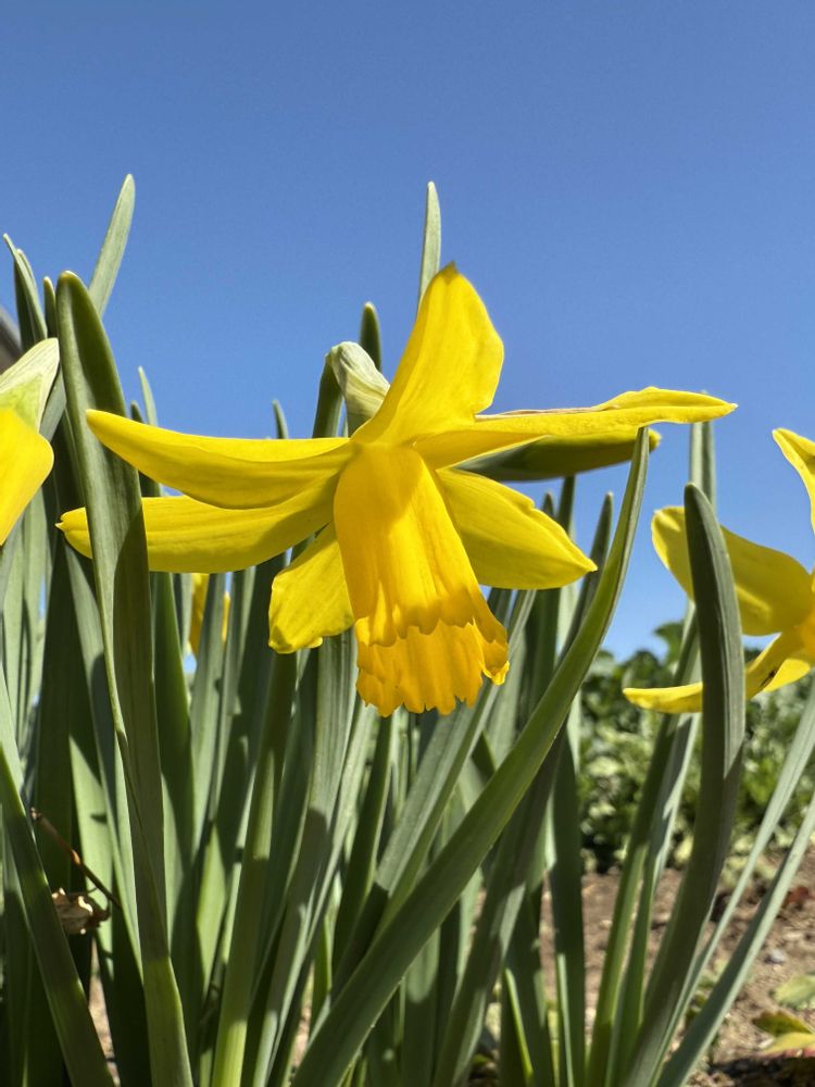 畑の片隅にノースポール、ハナニラ、ラッパ水仙などが咲き、