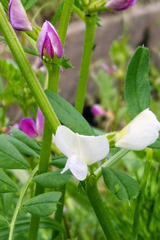 ①の白花カラスノエンドウの背景に開きかけの赤花カラスノエンドウが写り込んでいます