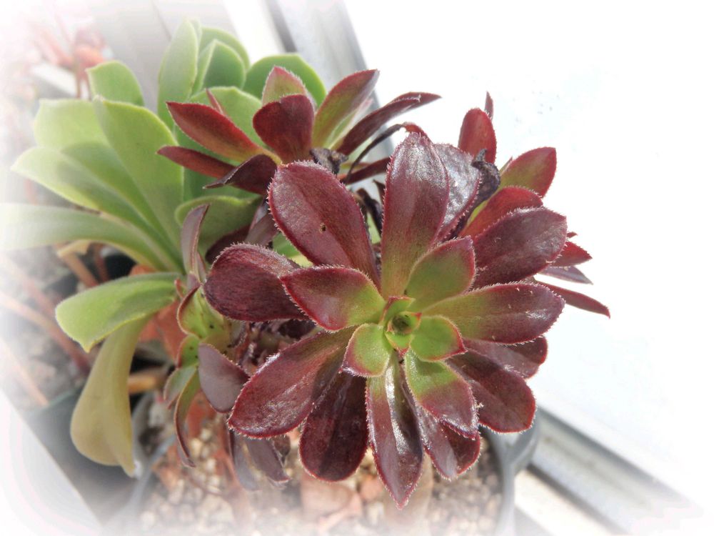 ところがコレ、学名がサンシモン(Saint Simon)なのかと思いきやそうではなく、しかもアルボレウム ツヴァルトコップ(Aeonium arboreum ‘Zwartkop’)説とアトロパープラム(Aeonium arboreum ‘Atropurpureum’)説があり、この二つは同じものかも知れないが定かではないらしい。