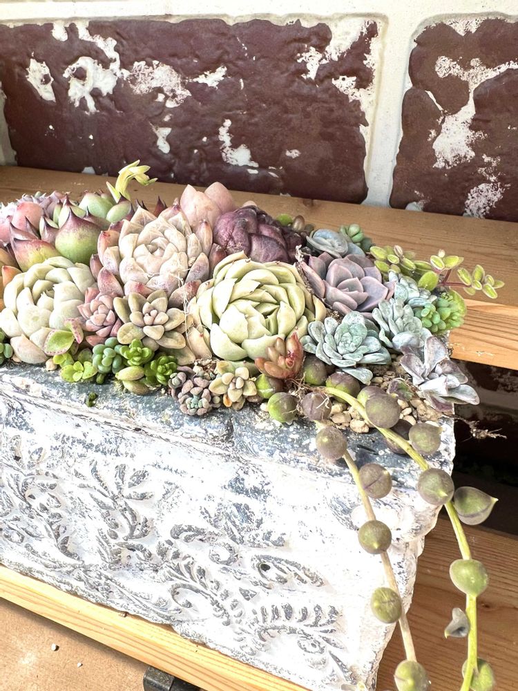 多肉の色とアンティーク鉢がいい感じにマッチしていますよ♡*。+