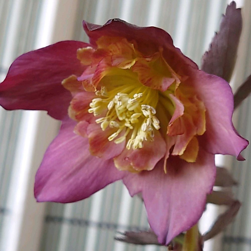 クリスマスローズカメレオンのネクタリー(内側小花弁)がふわりと広がり、色も外側花弁と同じ赤紫になってきました😍