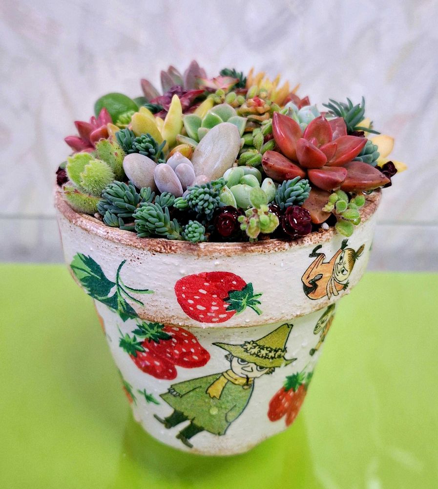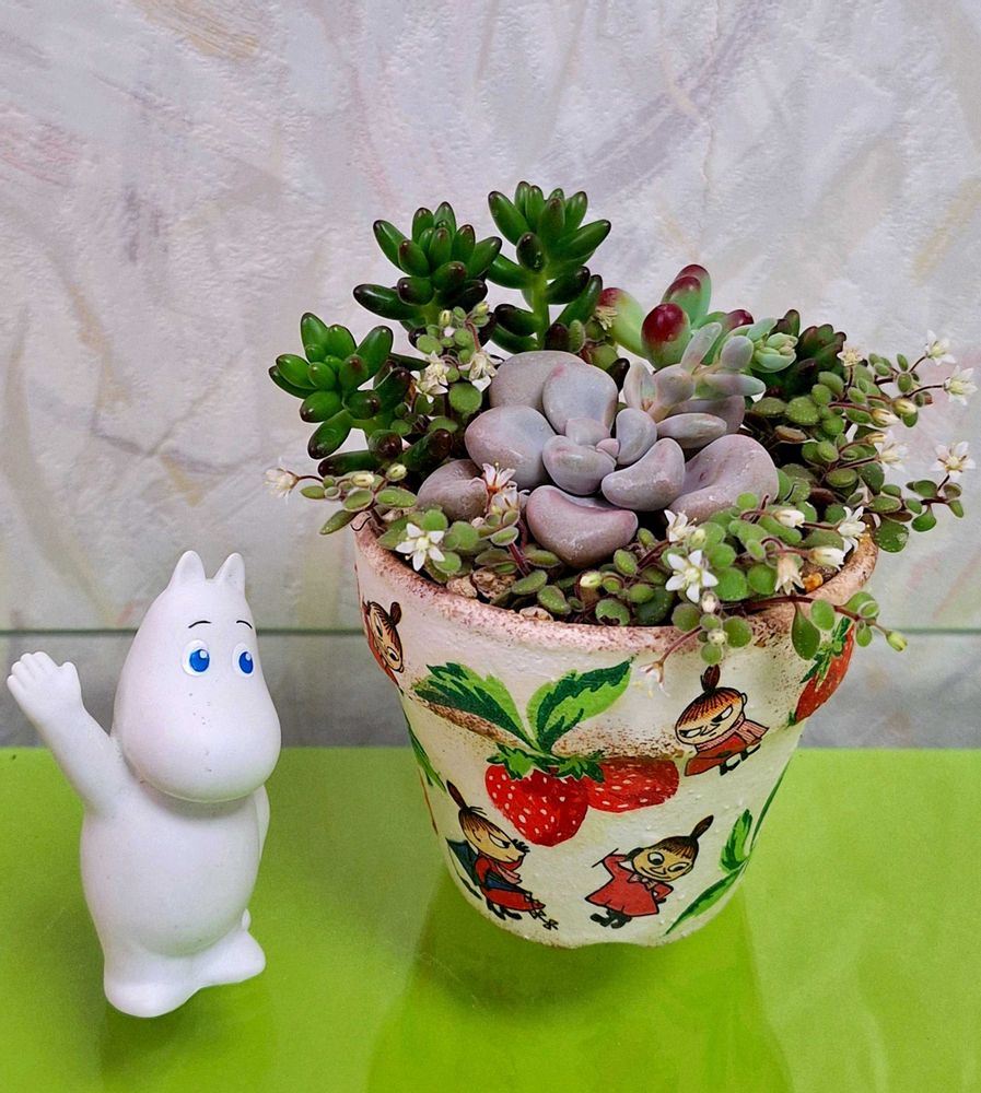 可愛いリメイク鉢ムーミンスナフキンだね。皆さん上手だね。なつ子さんお友達一杯良いなー私も何か作れるようになりたいなー寄せ植えも素敵ね💕