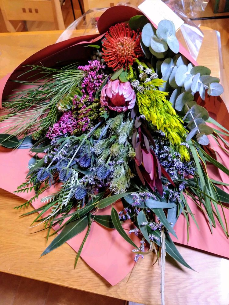 バンクシア入りの花束と迷いましたがプロテア入りの華やかさを選びました💐