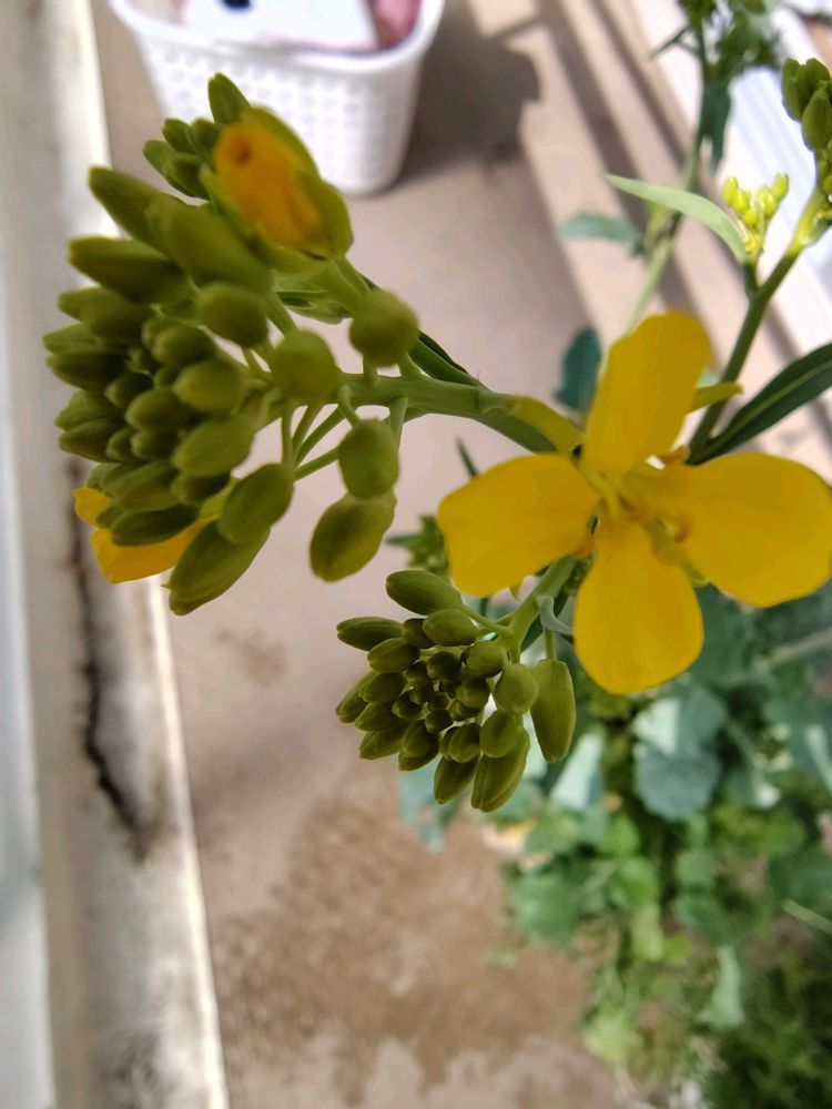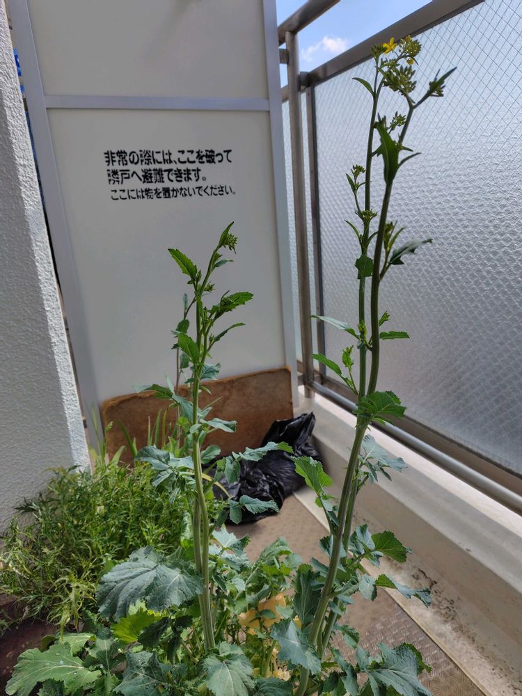 ベビーリーフちゃんの花芽が先週〜ニョキニョキ伸びて、ベランダの手すりの一番上に届きそうな勢いです。😲。