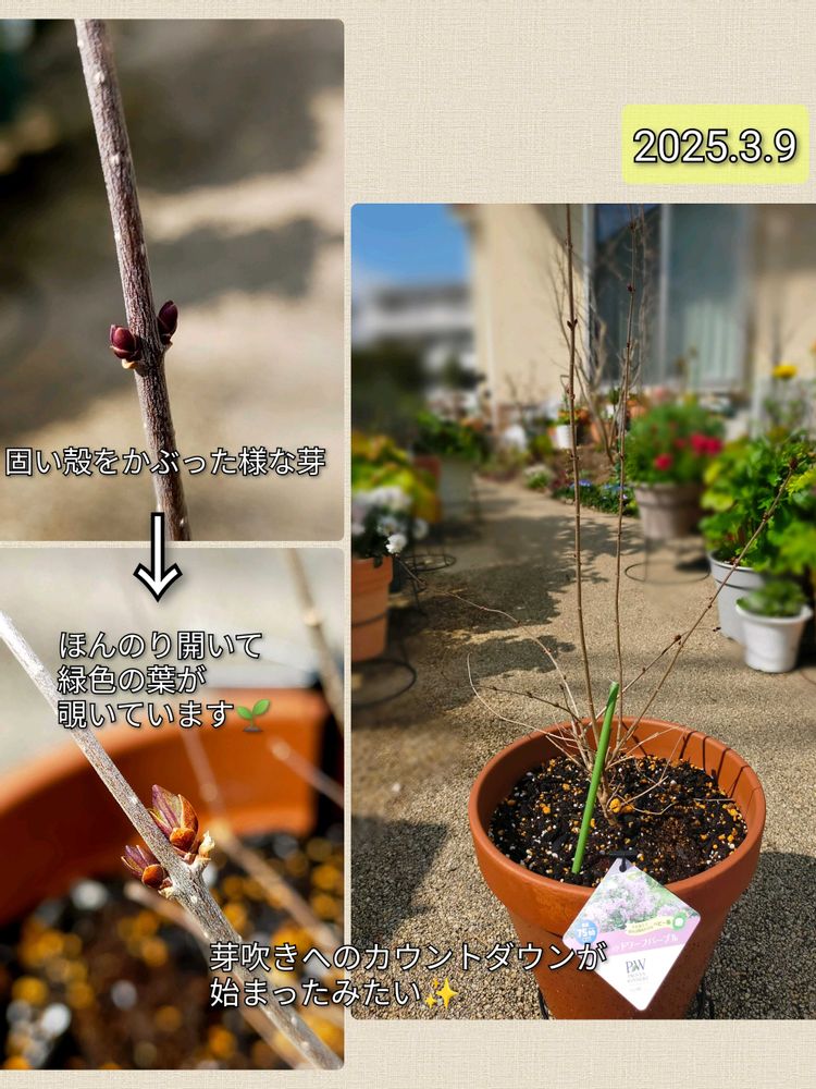 年明けに落葉してから枝だけのドワーフパープルでしたが、数日雨が続いた後の晴れた日、芽に変化がありました✨