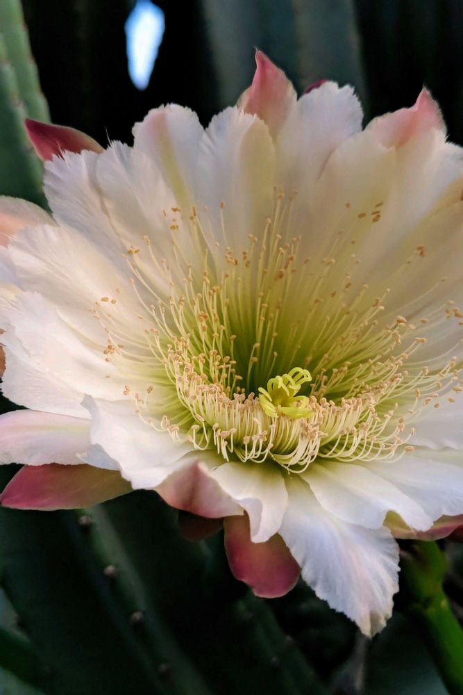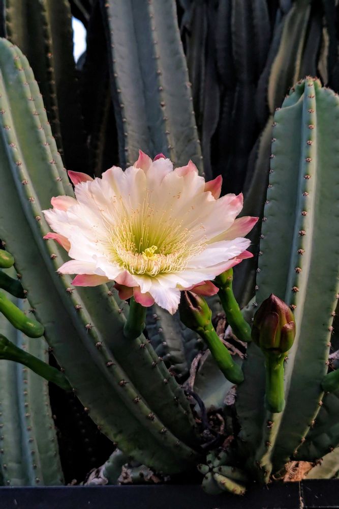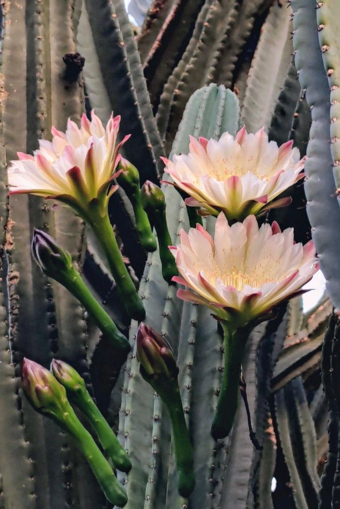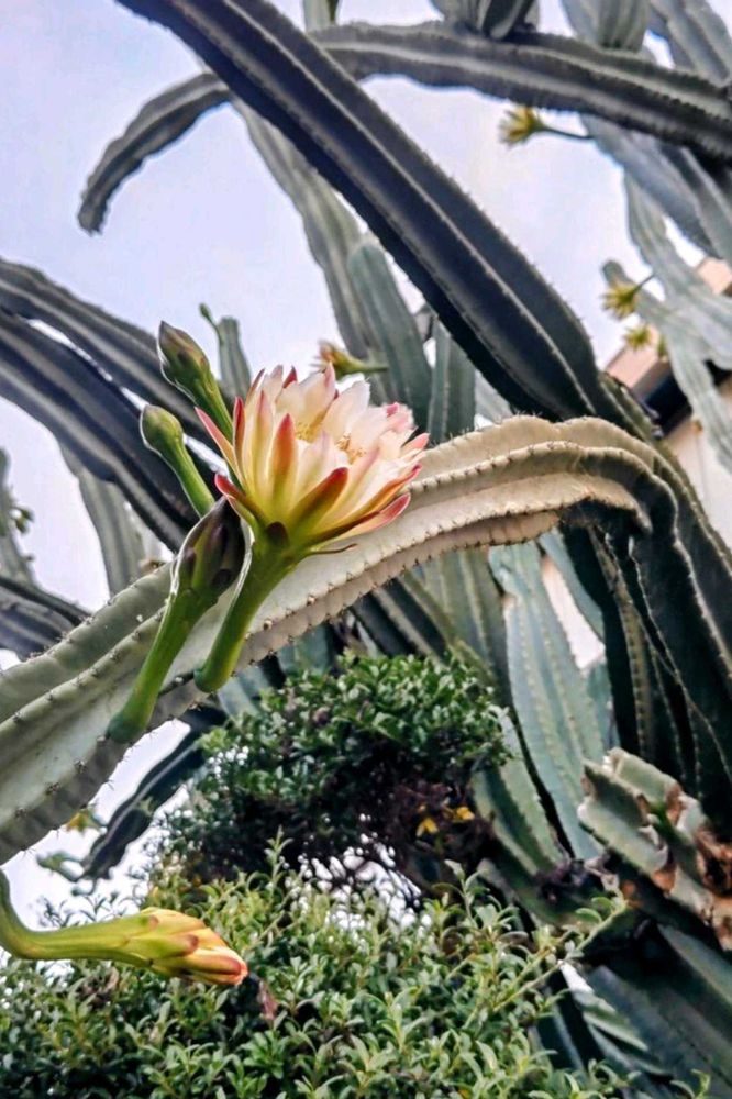 大きな柱サボテン🌵の花、夜咲いて朝には萎んでしまう花。早朝散歩で、綺麗に咲いてるところ見えて、嬉しいですね💕