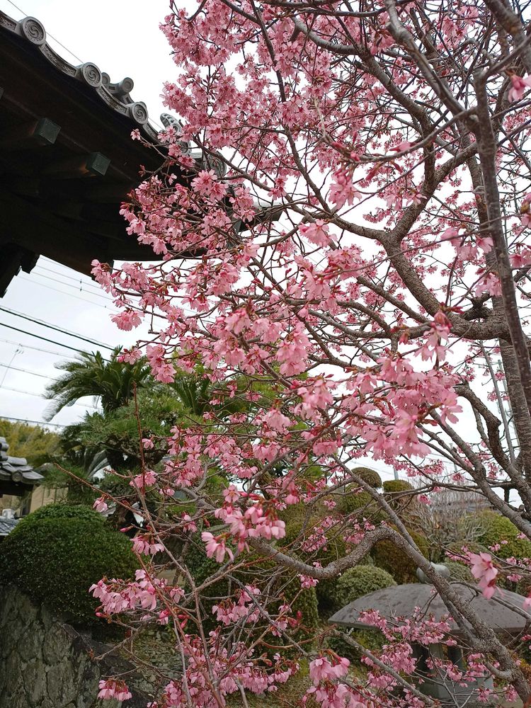実家近くのお寺の境内に濃いピンクの桜が満開でした。