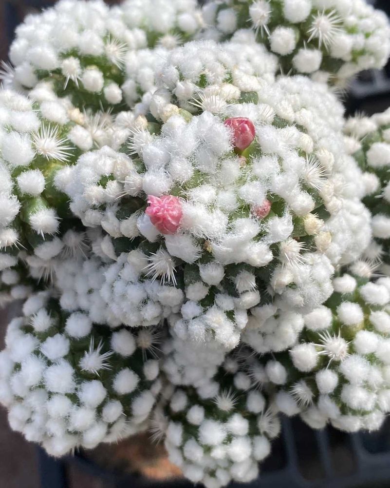 マミラリアの銀糸球(と言うのですね)にピンクのお花が、先日の雪を被った、庭のお花みたいに見えました😄