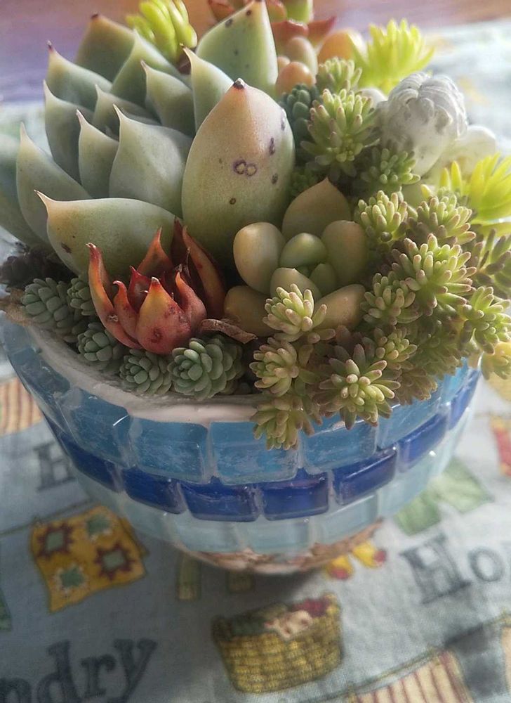 『海辺のマルシェ』で🧓が買ってくれた「多肉の寄せ植え」です。寄せ植えも可愛いですが、それ以上にこのリメ鉢の“完成度”に見惚れて居ます😍。