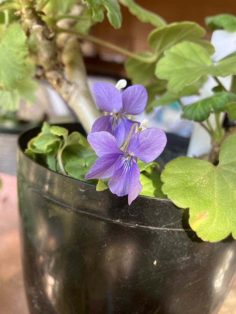 ゼラニウムの鉢に仮住まいしてるスミレがいち早く咲きました😃