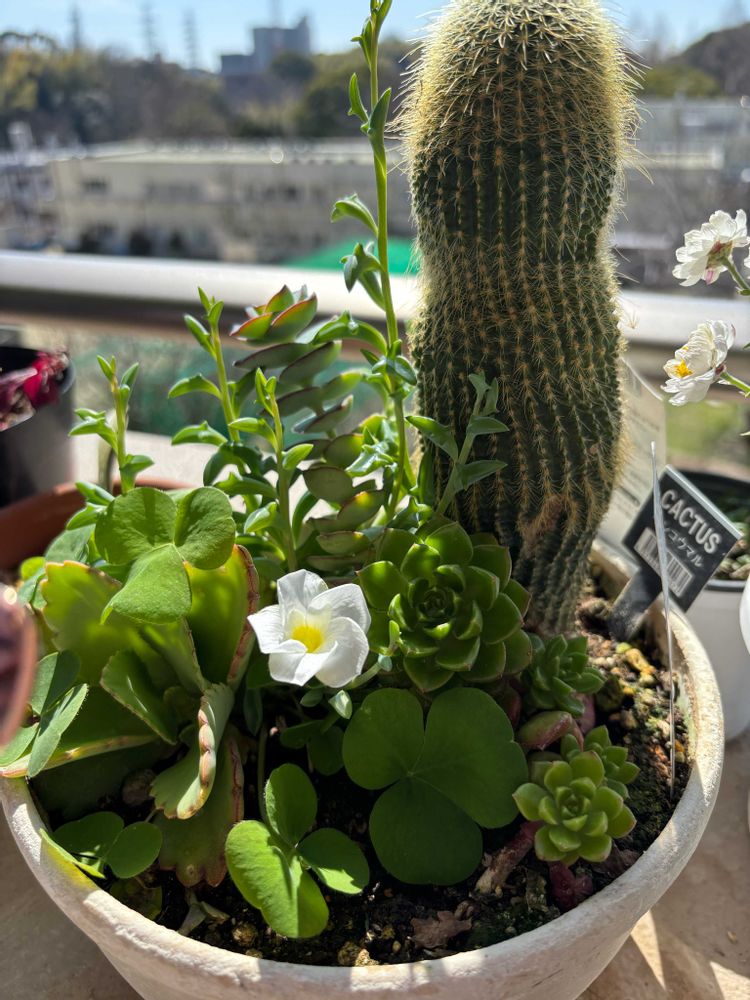 今朝のサボテン寄せ植え鉢に先ほど見たらオキザリスが開花して、殺風景の鉢を明るくしてくれました〜