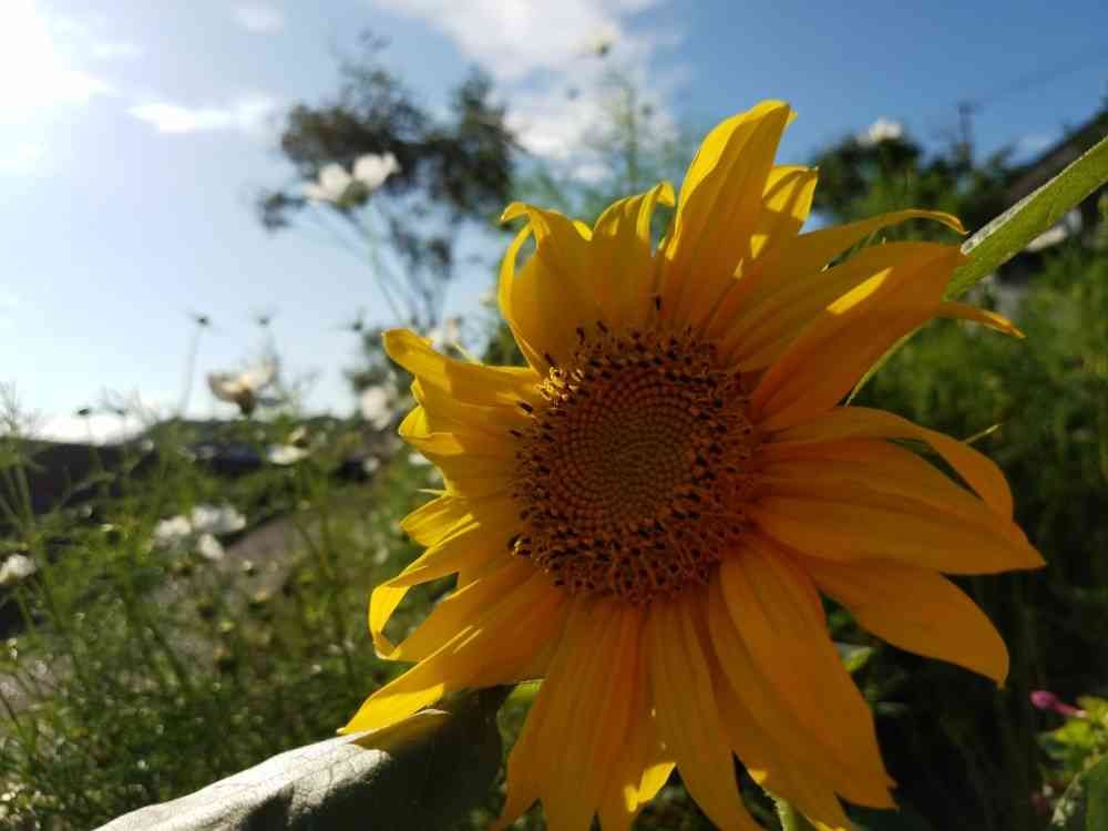 🌻🌻たぶん、ミニのひまわり。今年はひまわりが大きくなれず。種を頂きにやってくる小鳥たちに、ごめんなさい😵💦です。お日様を見てないひまわりちゃんを写してみました。逆光です。