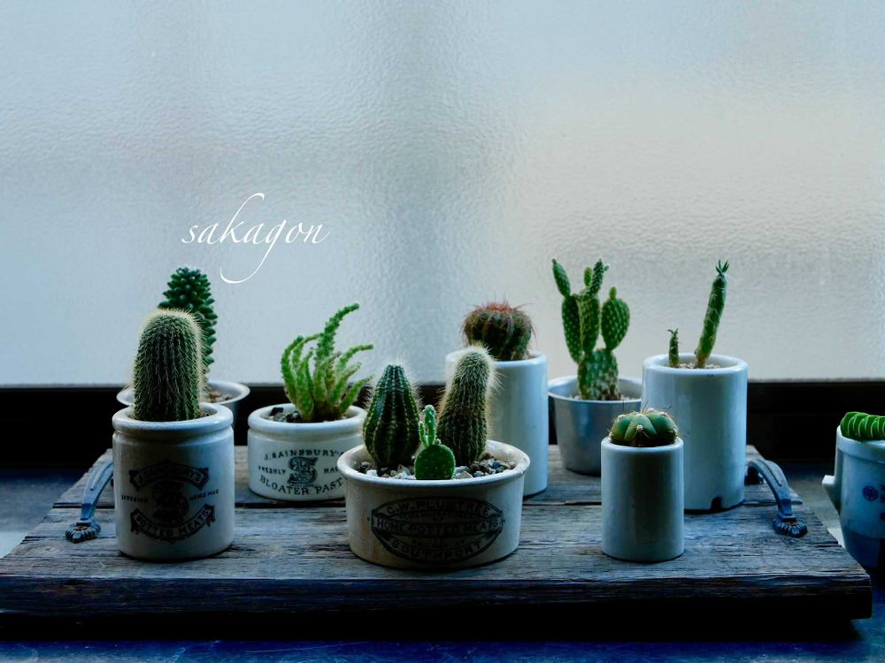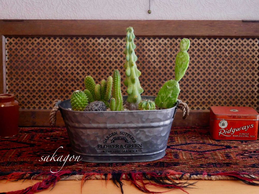 サボテンアレンジで有名なsolxsol さんの本を見て、雰囲気を真似てみました。古い器にサボテン植えるだけで、なかなか良いインテリアになりますよ〜🌵⚱️