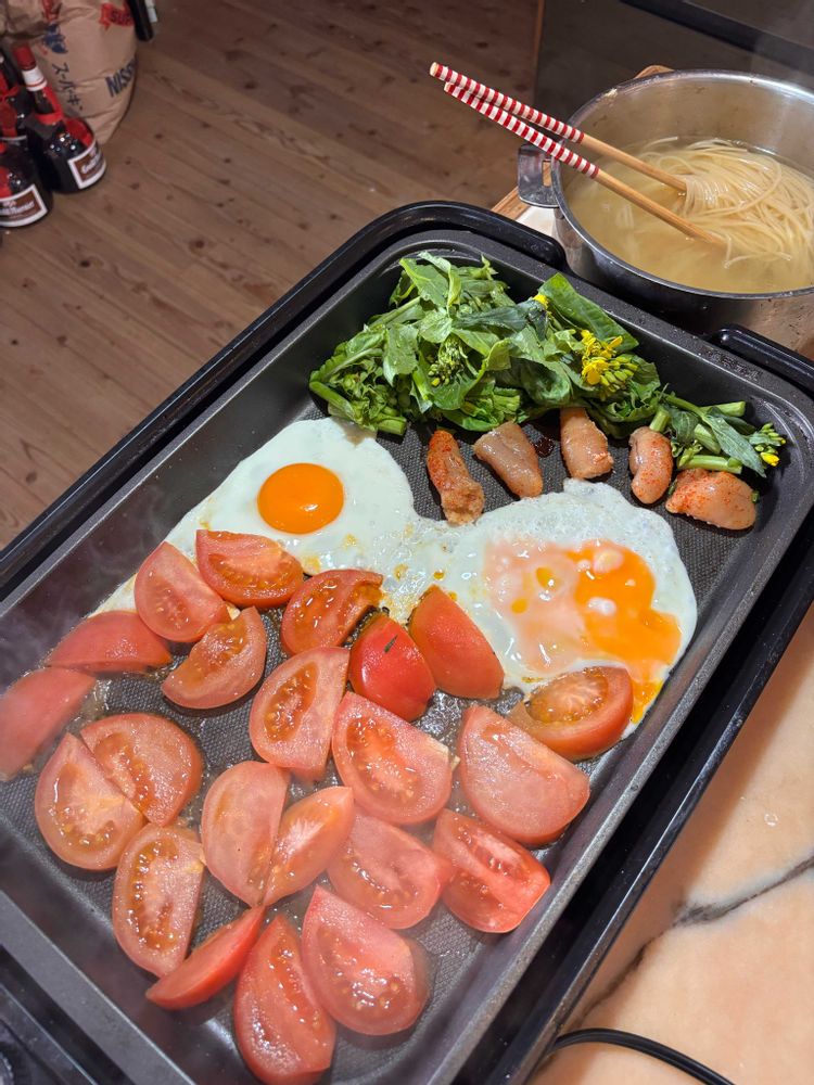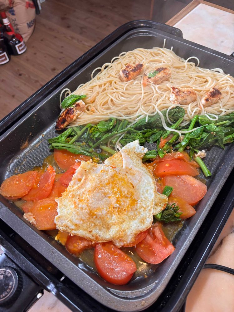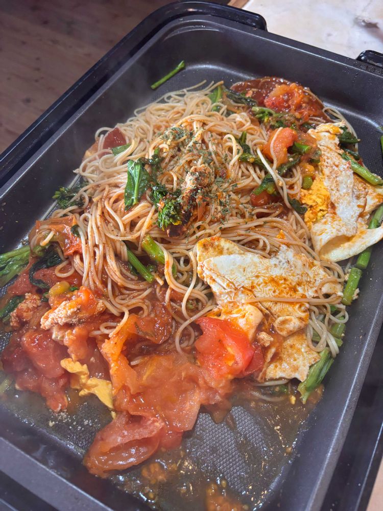 焼きスパゲッティ、トマト、菜の花、卵、ケチャップ