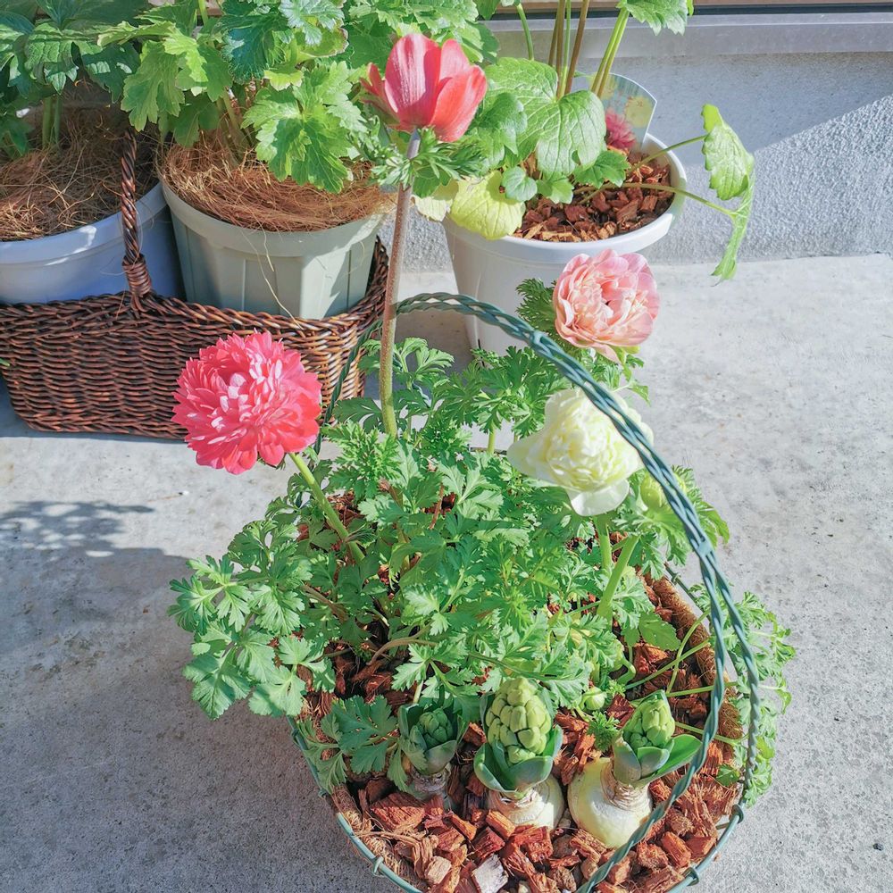蕾ついてた3株を買ってきてヒヤシンスとバスケット寄せにしたんですが、4色(赤·濃いピンク·淡いピンク·白)咲いてる!
