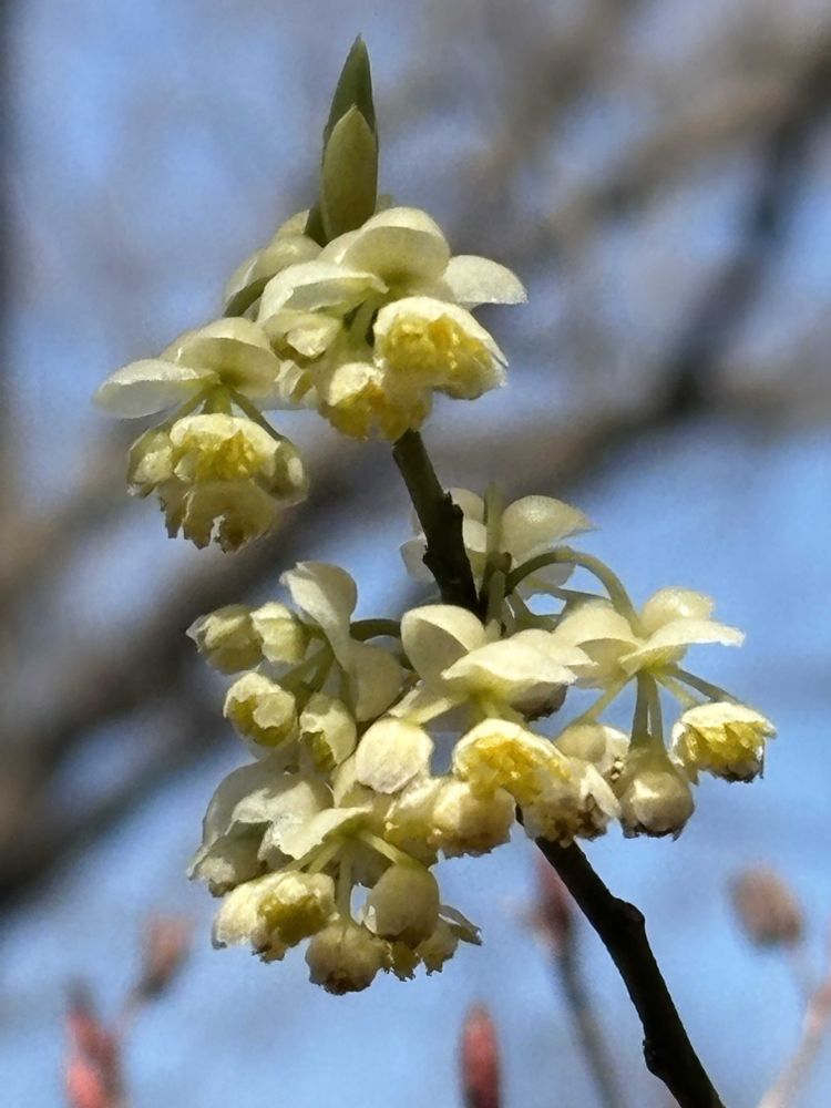 先日花友さんの投稿で覚えたアオモジ初めましてです。九州南部、沖縄が分布域だそうです。淡い黄色の花にうっとり❣️雌雄異株で、雄株は花がモリモリついてるらしいから、これは雄株かな?総苞片の中には4〜5個の小花がぎっしり詰まってます(②)想像より高い木で5メートルほどありました。3/9神代植物公園