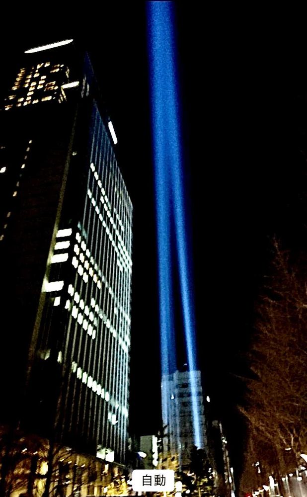 東日本大震災から10年が経った2021年3月11日(木)に、改めて震災への備えと教訓を次の世代へ継承すべく、また未来への希望を込めて「3.11希望の光」と題したライトアップが行われ大型照明8基32灯をまっすぐ天へと伸ばした「希望の光」の束でした•••