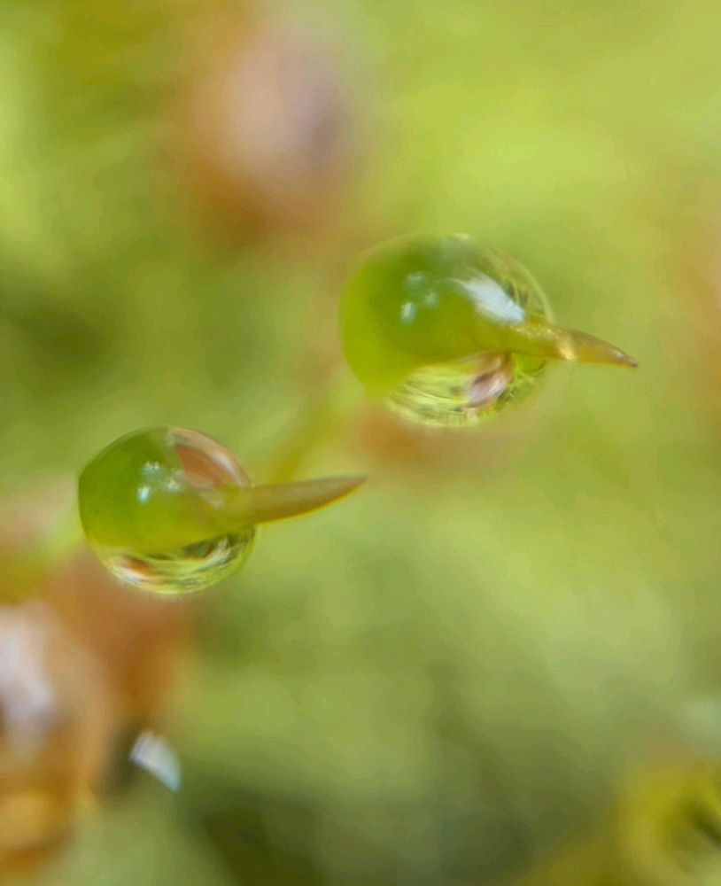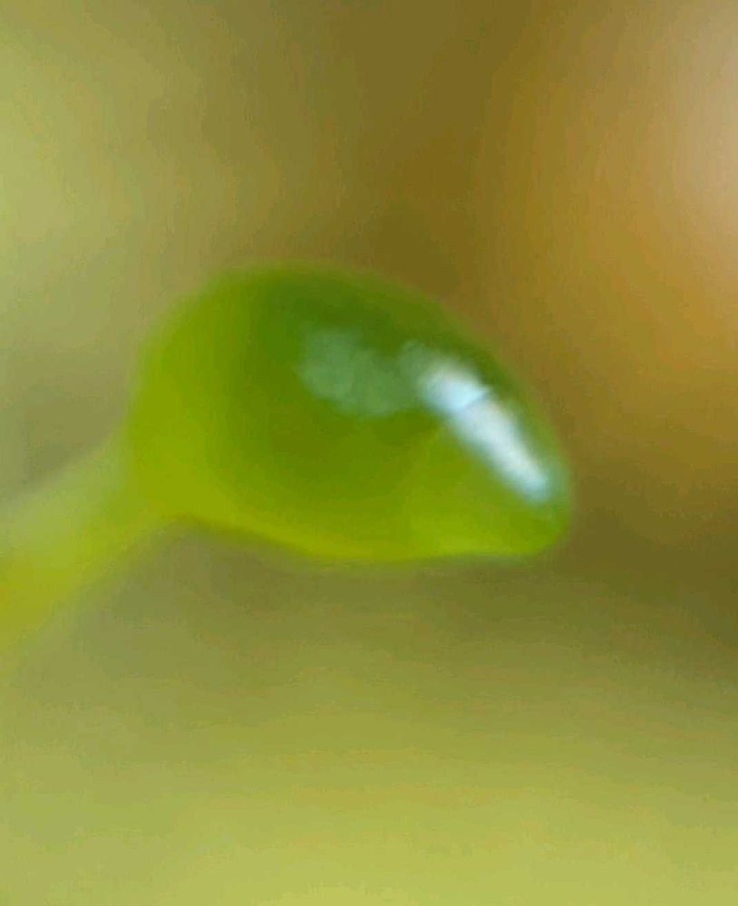 伸びてきた蒴が、帽に雫をまとわりつかせている🌱