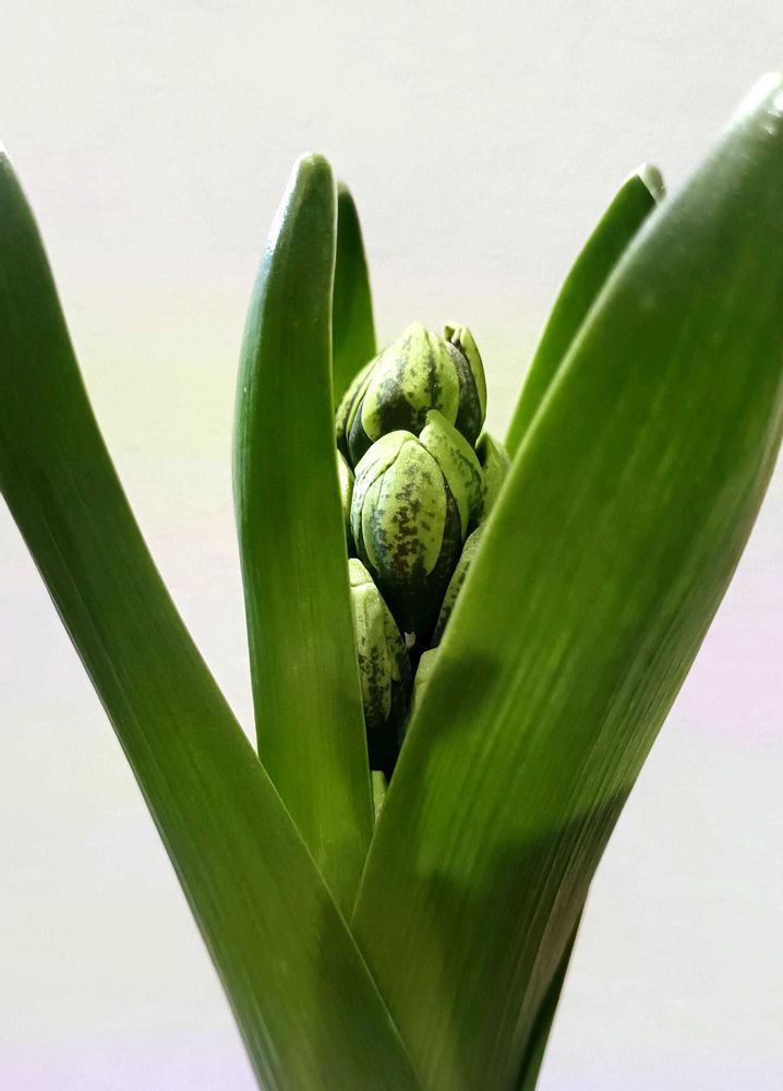 こちら紫色のお花になる筈です。今ピンクのヒヤシンスが満開なので、時期をずらすべく、寒いところでゆっくりゆっくり育てています🪻