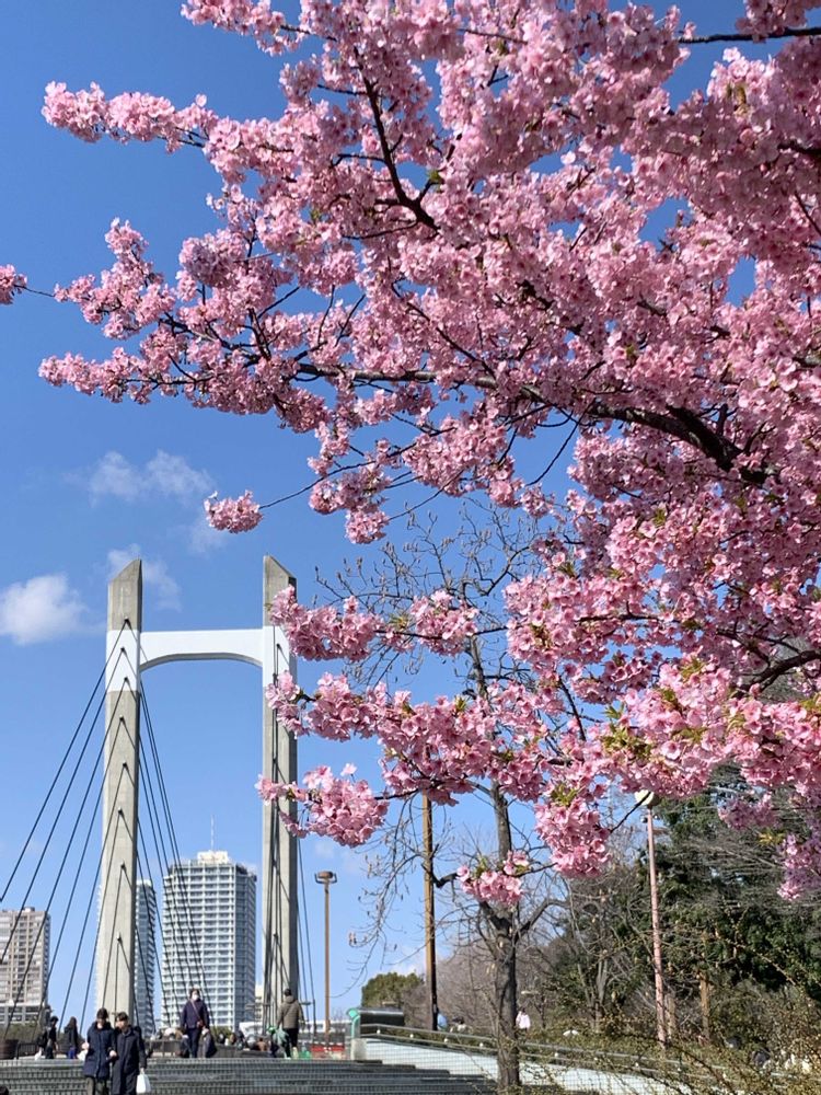 木場公園大橋をバックに桜を撮りました🌸🌸🌸
