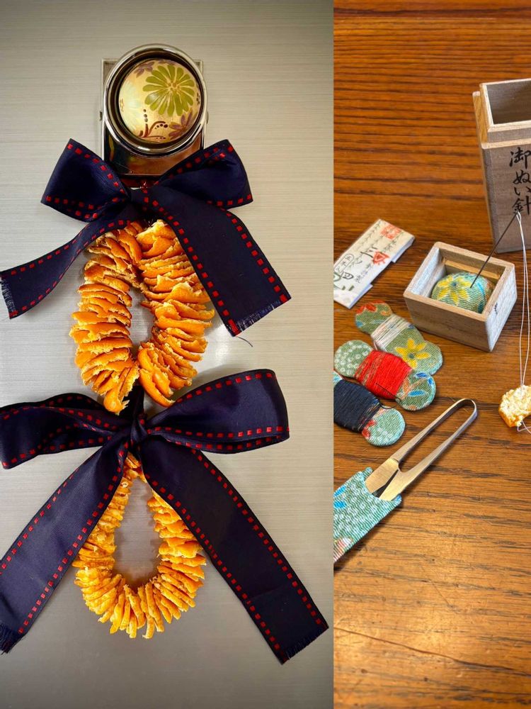 リボンとみかんがマッチしてかわいいか出来たね!糸だと皮が乾いたらダラーんとなるけど、細い針金だと丸いリースになるよ。