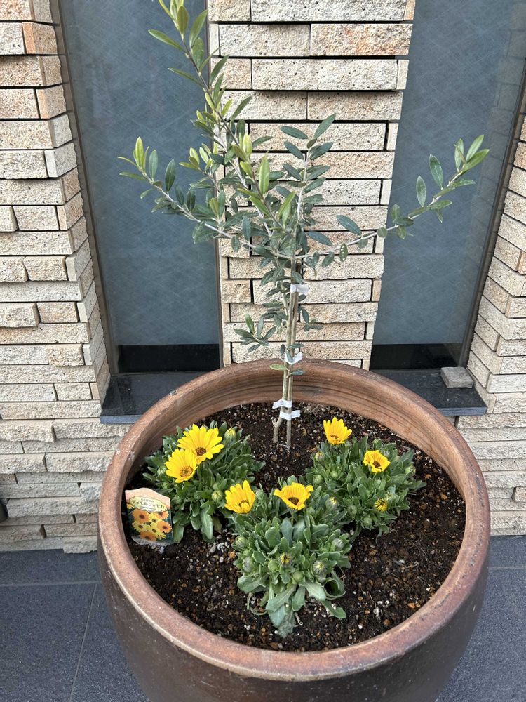 家族で行った飲食店の寄せ植え🌿🫒🌼