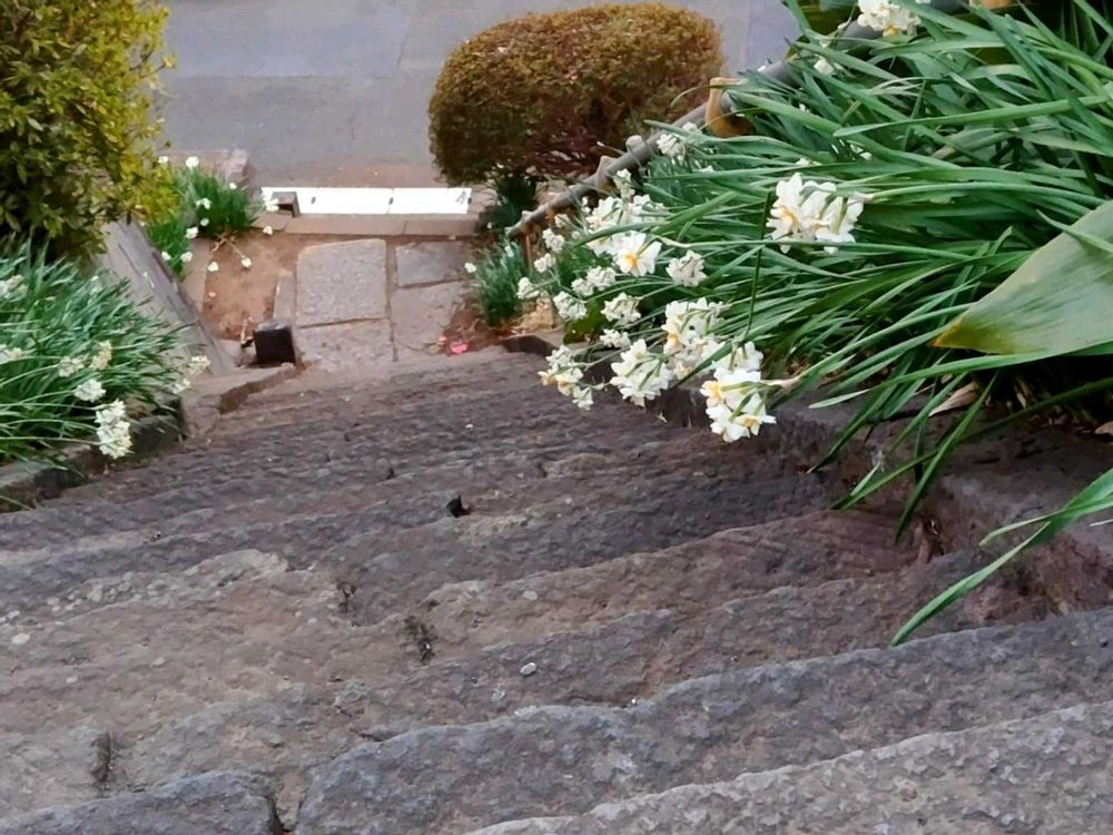 近くのお寺の急な石段の両脇に日本水仙が