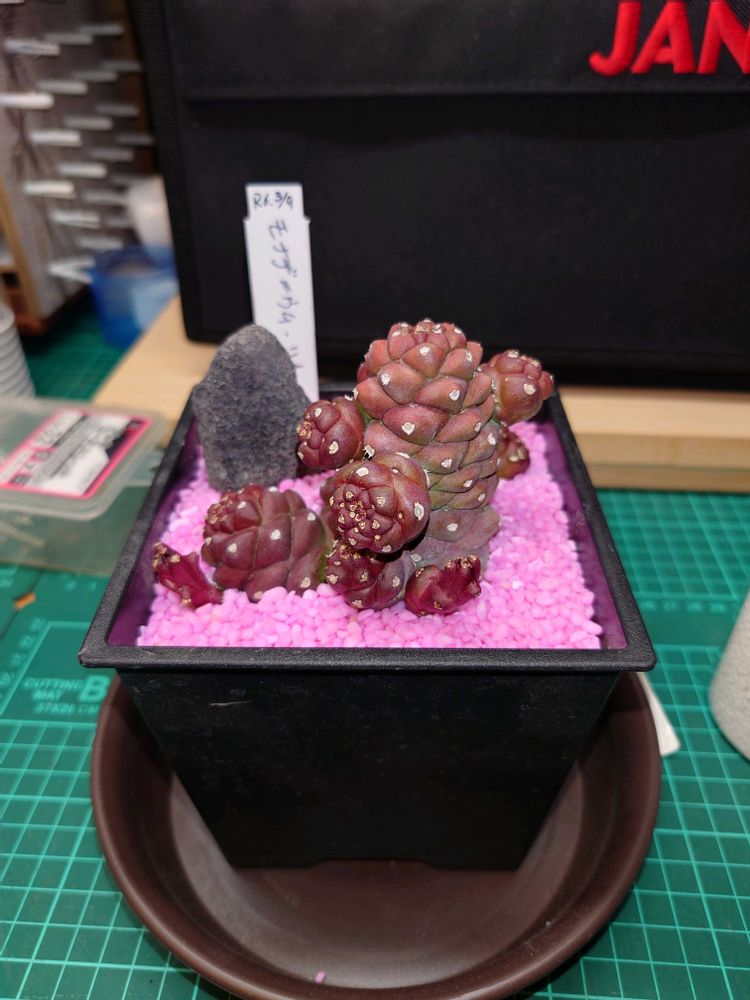 運搬中に倒してしまって、急遽植替えすることになりました。根っこの状態も悪くは無かったです。用土は軽石(ひゅうが土)を使用して水はけを良くするように施しました。今は紅葉(夏になると緑に変化するかも)しているので、仕上げ砂に、ピンクのカラーゼオライト(水槽用)を使用しました。また、セリアの溶岩石も付け足したら、趣のあるいい感じに仕上がったと思います。