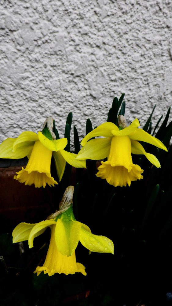 小さな庭の、大輪のラッパスイセンの花が、咲揃って来ました。