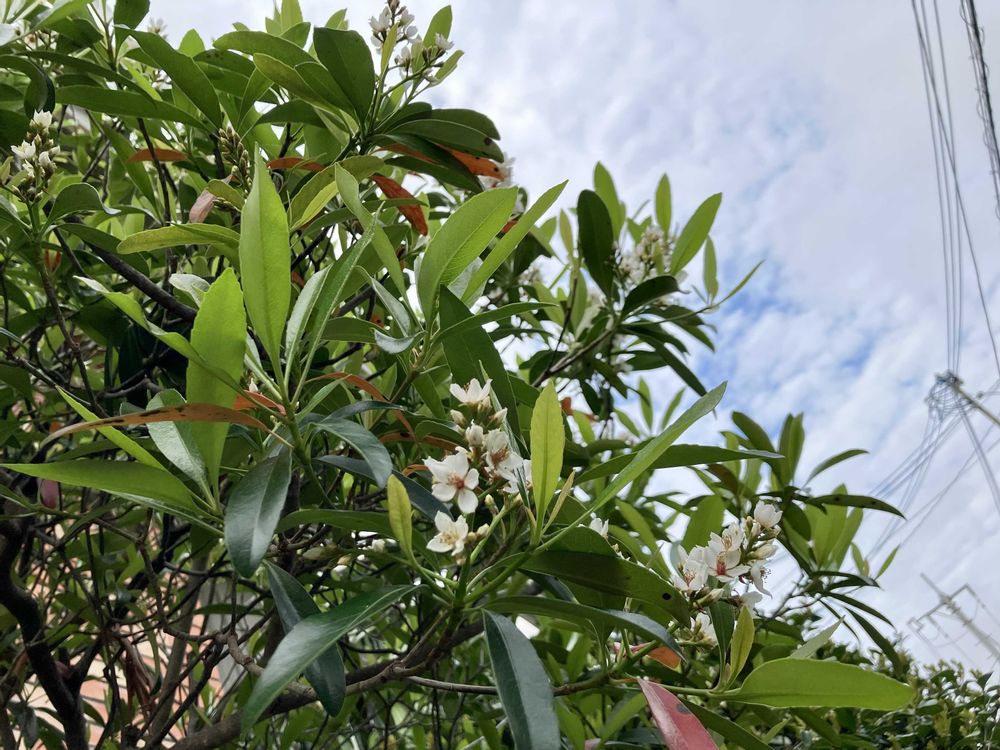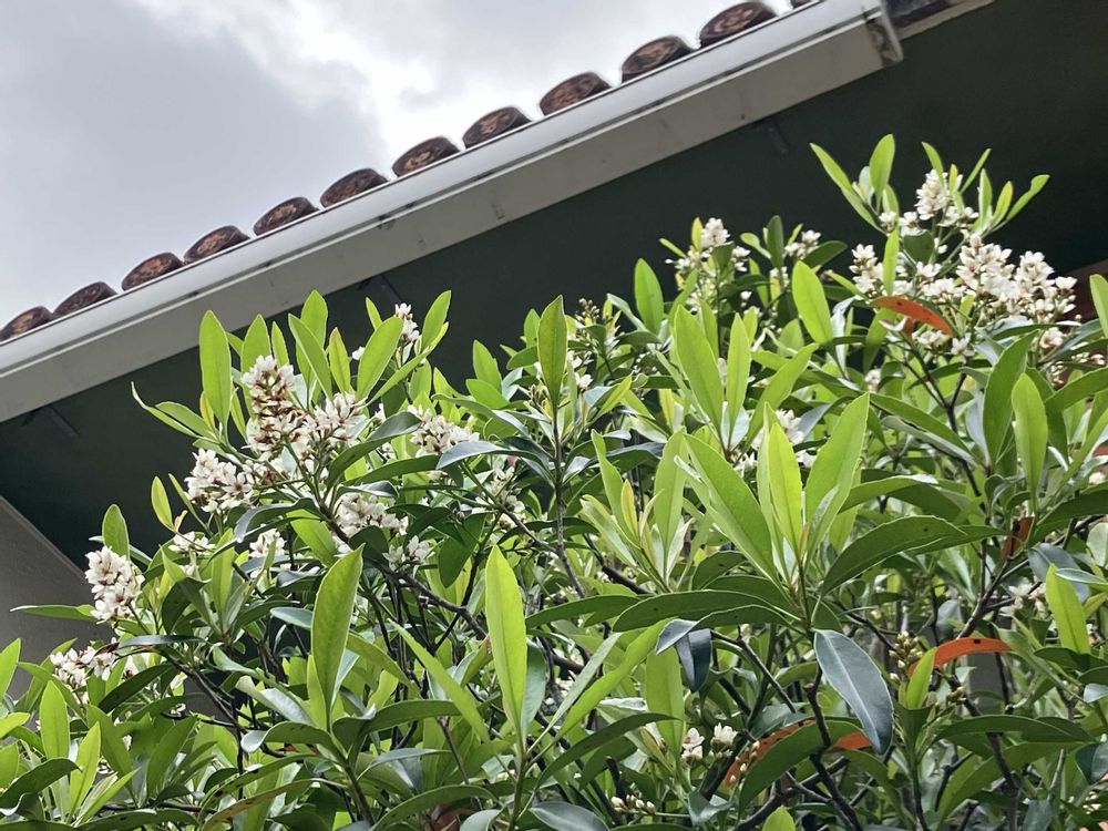 そしてこれも頭上だから、手を伸ばして勘で撮った我が家のオキナワシャリンバイ。