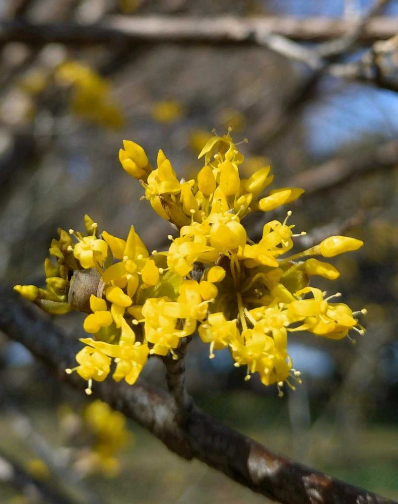 ミズキ科ミズキ属の落葉小高木。中国原産で江戸時代に中国から薬用として渡来した。庭や公園に花木としても植えられる。花の少ない早春、葉の出る前に黄色の花が木全体に咲くのでよく目立つ。枝は斜めに立ち上がり、直径4~5㎜の小さな花が1ヶ所に20~30個かたまって咲く。小さな花の花弁は4枚で、先が尖って反り返る。果実は1.5㎝ほどの楕円形で、秋に熟すと赤くなり、噛むと甘味が少なく酸味と渋みがある。