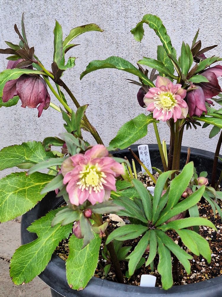 ①シングルの濃い赤紫のクリスマスローズと、ピンクっぽいダブルのクリスマスローズが同居しています❕😆